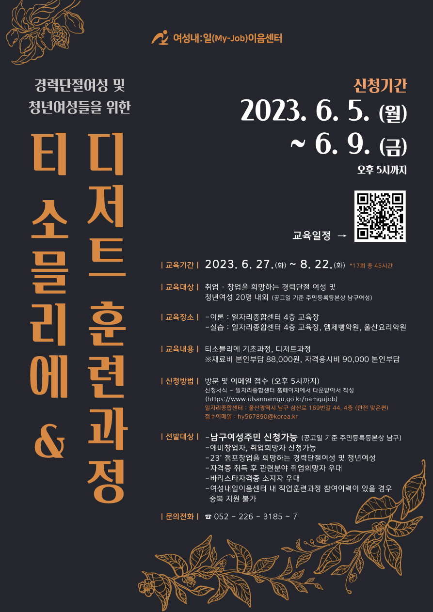 1. 신청기간 : 2023. 6. 5.(월) ~ 6. 9.(금) 오후 5시까지 2. 교육기간 : 2023. 6. 27.(화) ~ 8. 22.(화) *17회 총 45시간 3. 교육대상 : 취업·창업을 희망하는 경력단절 여성 및 청년여성 20명 내외 (공고일 기준 주민등록등본상 남구여성) 4. 교육장소 - 이론 : 일자리종합센터 4층 교육장 - 실습 : 일자리종합센터 4층 교육장, 엠제빵학원, 울산요리학원 5. 교육내용 : 티소믈리에 기초과정, 디저트과정 ※ 재료비 88,000원 및 자격응시비 90,000원 본인부담 6. 신청방법 : 방문 및 이메일 접수 (오후 5시까지) - 신청서식 : 일자리종합센터 홈페이지에서 다운받아 작성 (https://www.ulsannamgu.go.kr/namgujob) - (방문) 일자리종합센터 : 울산광역시 남구 삼산로 169번길 44, 4층 (한전 맞은편) - (이메일) hy567890@korea.kr 7. 선발대상 - 남구여성주민 신청가능 (공고일 기준 주민등록등본상 남구) - 예비창업자, 취업희망자 신청가능 - 23' 점포창업을 희망하는 경력단절여성 및 청년여성 - 자격증 취득 후 관련분야 취업희망자 우대 - 바리스타자격증 소지자 우대 - 여성내일이음센터 내 직업훈련과정 참여이력이 있을 경우 중복 지원 불가 8. 문의전화 : 052-226-3185~7