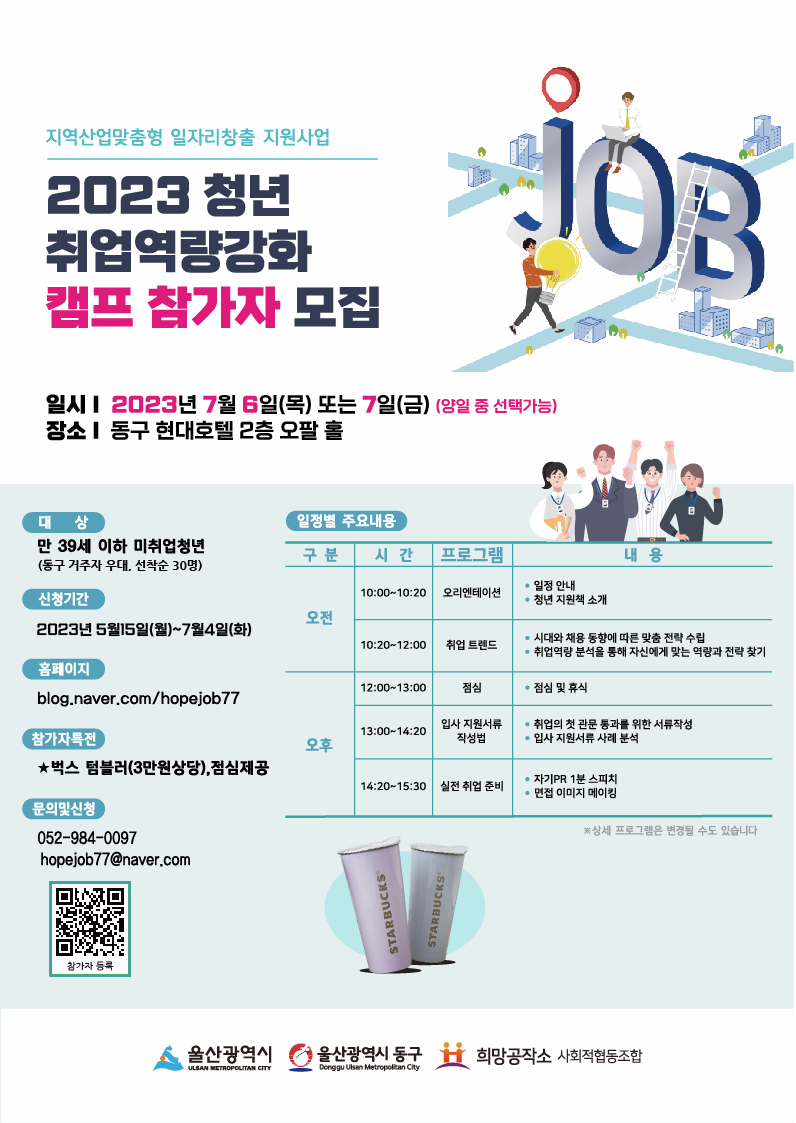 - 일시 : 2023년 7월 6일(목) 또는 7일(금) *양일 중 선택가능 - 장소 : 동구 현대호텔 2층 오팔 홀 - 대상 : 만 39세 이하 미취업청년(동구 거주자 우대, 선착순 30명) - 신청기간 : 2023년 5월 15일(월) ~ 7월4일(화) - 홈페이지 : blog.naver.com/hopejob77 - 참가자특전 : 스타벅스 텀블러(3만원상당), 점심제공 - 문의 및 신청 : 희망공작소 사회적협동조합, 052-984-0097 / hopejob77@naver.com |