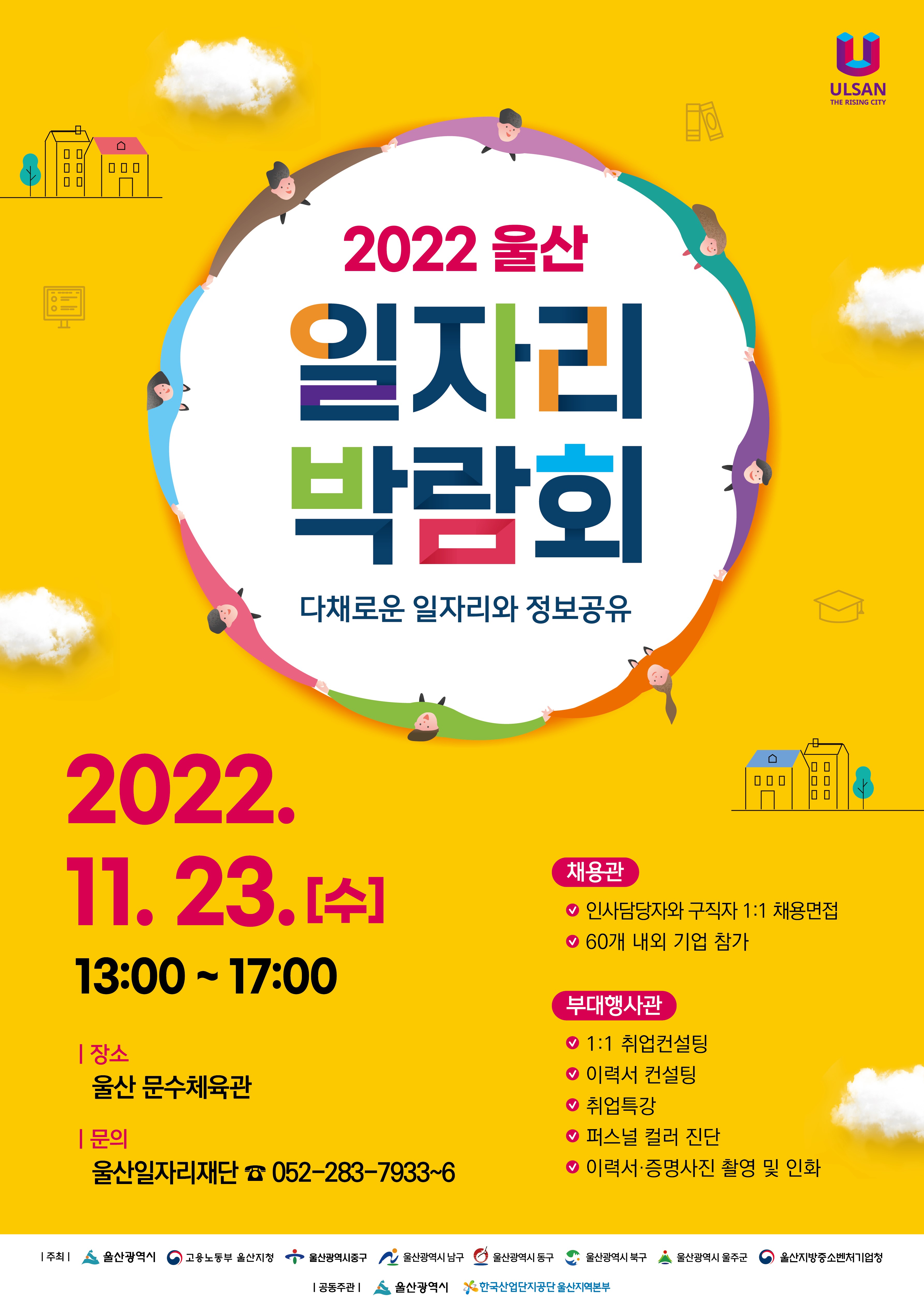 - 일시 : 2022. 11. 23. (수) 13:00~17:00 - 장소 : 울산 문수체육관 (울산 남구 웅촌로 1342) - 채용관 : 60개 내외 기업 참가, 인사담당자와 구직자 1:1 채용 면접 - 부대행사관 : 1:1 취업컨설팅, 이력서 컨설팅, 취업특강, 퍼스널 컬러 진단, 이력서·증명사진 촬영 및 인화 - 문의 : 울산일자리재단 ☎ 052-283-7933~6