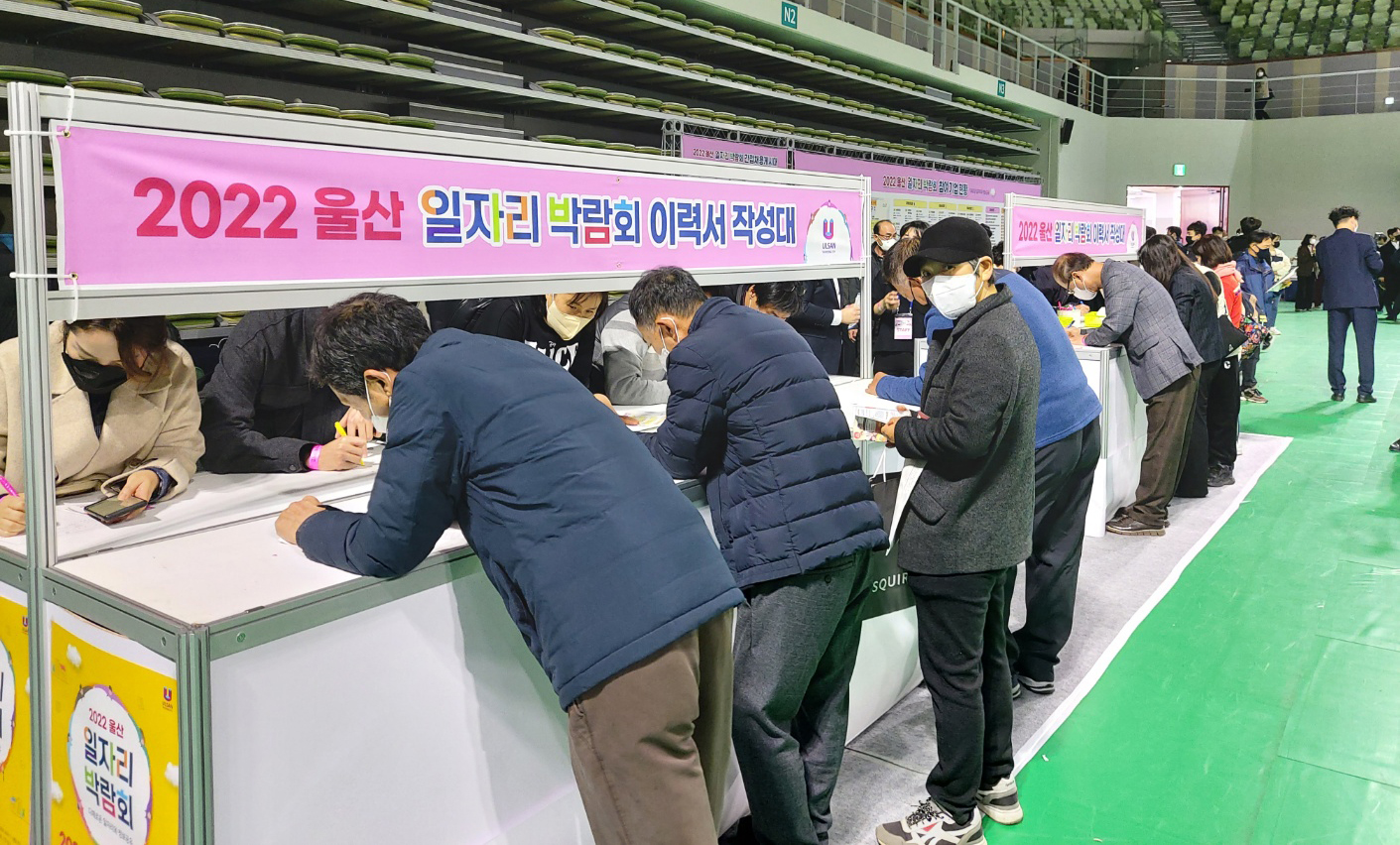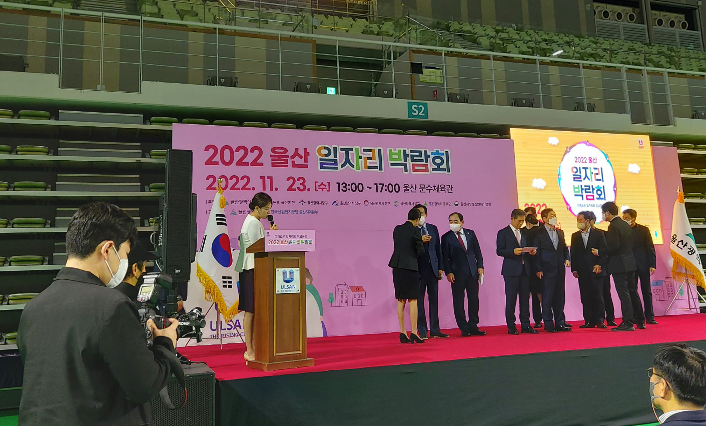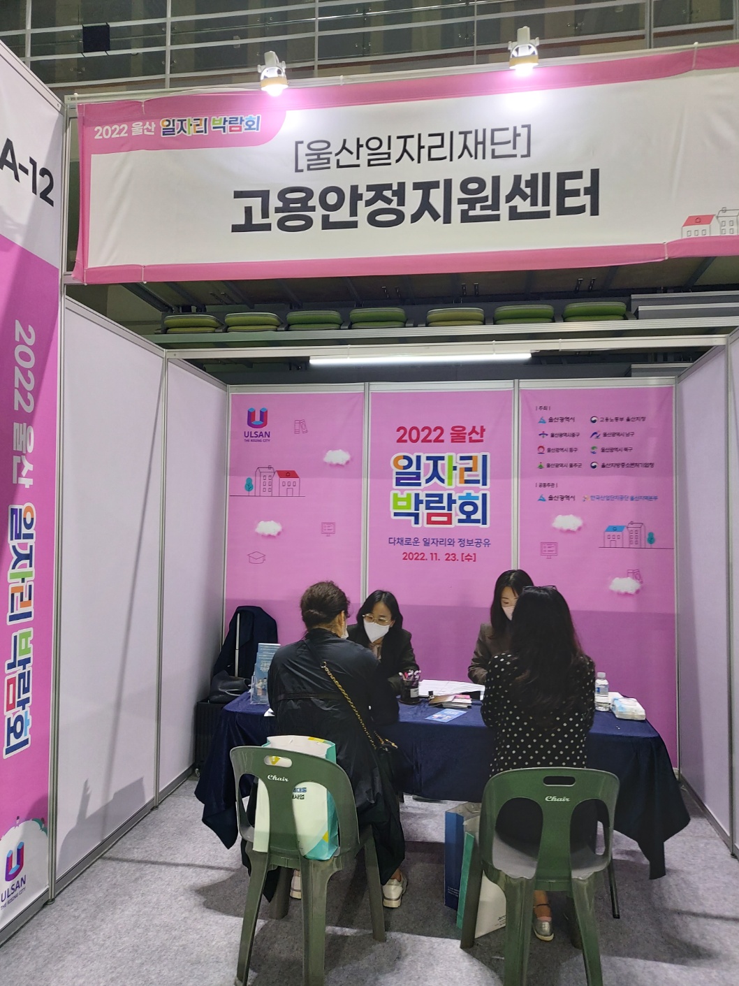 - 행 사 명 : 2022년 울산 일자리 박람회 - 일시/장소 : ‘22. 11. 23.(수) 13:00 ~ 17:00 / 문수실내체육관 - 개 막 식 : ‘22. 11. 23.(수)15:00 ~ 15:22/ 문수실내체육관 특설무대 - 부대행사 : 사진스튜디오, 컬러성향분석, 퍼스널칼라/면접이미지, 입사지원서컨설팅, 메이크업, 감정오일테라피, 타로카드, 직무컨설팅 등 총 347명 참여 - 행사결과 : 총 방문인원 1,928명 / 현장면접 736명 / 채용예정자 150명 / 만족도조사 735명 참석 |